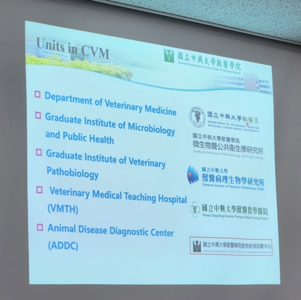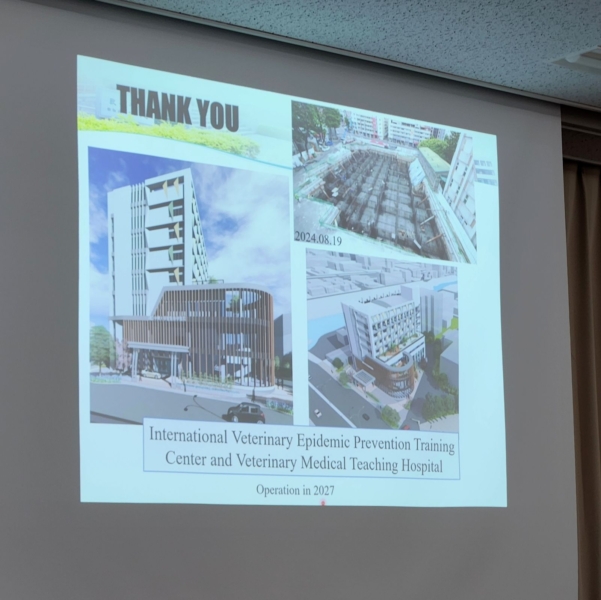 はじめに、2023年度途中まで本学でも勤務されたDr. CHEN I-Yingより、中興大学の紹介や、新しく建設中のInternational Veterinary Epidemic Training Center and Veterinary Medical Teaching Hospital(国際獣医疫病研修センターおよび獣医学教育病院)について説明されました。