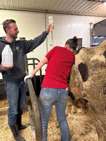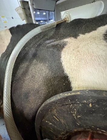 コリンとは細胞膜の構成要素であり、神経伝達物質の材料にもなる重要な栄養素です。通常、経口的に摂取されたコリンはルーメン内で分解され、その効果を失ってしまいます。そこで本実験では、ルーメンフィステルを装着した乳牛を用い、コリン溶液を直接第四胃(アボマサム)に注入する手法が採られていました。(図2)具体的な手技としては、まずチューブをルーメン内で前方に進め、ルーメンピラーと呼ばれる隆起部を回り込みます。その先に「meso-orifice」と呼ばれる小さな開口部があり、そこにチューブを挿入することで、最終的にアボマサムに到達させることができます。私も実際にこの工程を体験し、手でチューブを辿る中でその小さな開口部をはっきりと感じることができました。なお、私は初乳製剤会社の見学に参加していたため立ち会うことはできませんでしたが、注入後は血中のコリンおよびその代謝産物濃度の推移を観察するために、一定時間をおいて採血が行われていました。