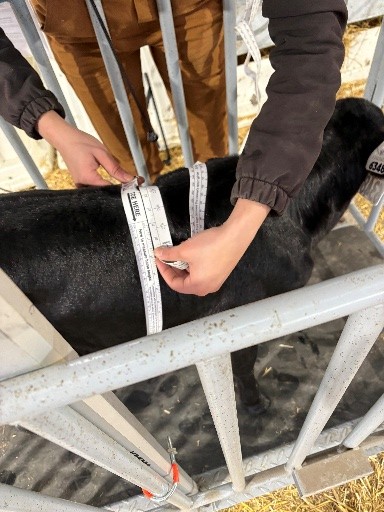 私は現地で、対象牛の臨床スコア評価(図3)や直腸温の計測(図4)、さらに子牛のBCSスコア導入に向けた体重や腹囲、座骨幅などの測定にも立ち会いました。(図6)また、こちらの実験は大学内の農場ではなく、キャンパスから車でおよそ30分の場所にある「Haverland Dairy」という、学外の大規模農場で行っていました。カナダで大学外の農場に足を運ぶ機会があるとは思っていなかったため、実践的な場で学ぶことができたのは非常に貴重な経験となりました。