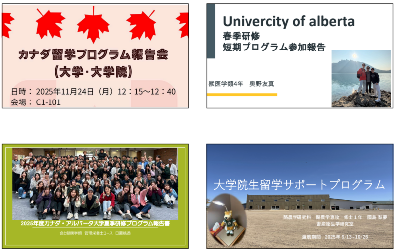 報告は、アルバータ大学夏季研修プログラムに参加した獣医学類4年・奥野友真さん、食と健康学類3年・日置桃香さん、大学院生留学サポートプログラムに参加した酪農学研究科 酪農学専攻修士課程1年・國島梨夢さんの順に行われ、留学したきっかけ、実際の学校生活やホームステイの様子、留学で得たものや今後の目標など、写真や動画を交えて紹介されました。