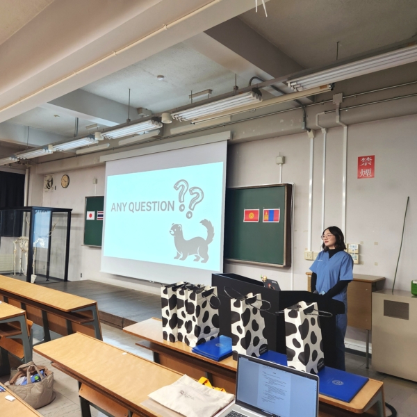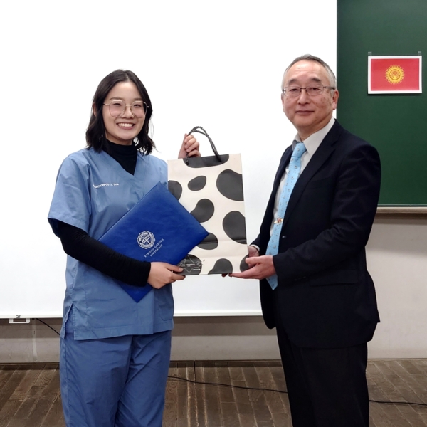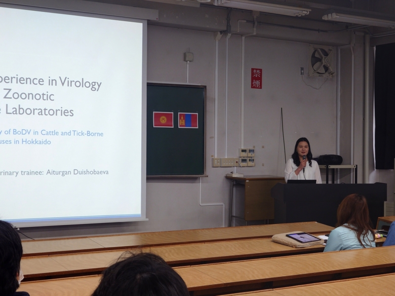 Ms. Aiturgan Duishobaeva(キルギス・トルコ・マナス大学)は、獣医学類・獣医ウイルス学ユニット(萩原教授)および人獣共通感染症学ユニット(村松教授・内田准教授)にて、約1年間(2025年4月 ~ 2026年3月)にわたり研修を行いました。