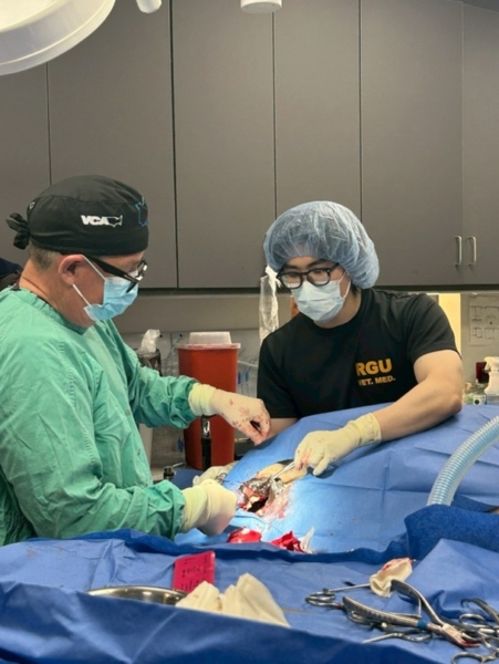 2つ目は、VCA animal hospitalという病院施設だけでなく、リハビリ施設や保護施設などもある大きな病院を見学させていただきました。ここでは、実際に口腔内の腫瘍を切除するオペの補助をさせていただくことができました。このオペは救うためのものというよりも、飼い主さんが安楽殺を受け入れられようにするための最後のオペだとおっしゃっていました。忙しい現場で緊張感もある中でも、症例やその背景、オペで今何を行っているのかなど丁寧に説明していただき、色々な症例について学ぶことができました。